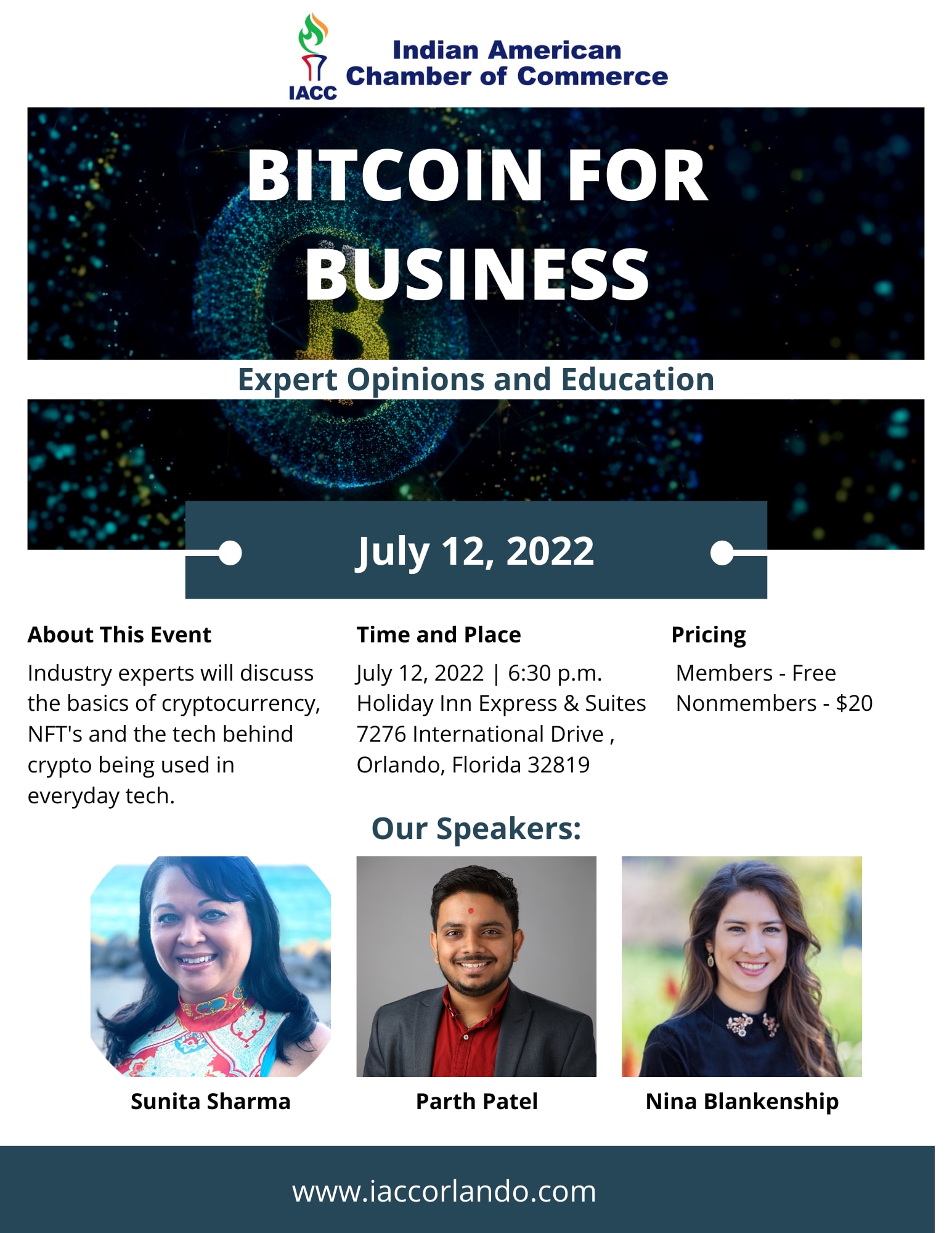 Come and join the Indian American Chamber of Commerce (IACC) and learn about the world of Bitcoin from three area experts. They will discuss topics including: What is Crypto? How does it develop value? Is it time to sell? How low may the values go? What is a NFT? How is the tech behind Cryptos being used in everyday tech?